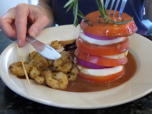 The main dish for Laurie was a caprese tower of sliced tomato, mozzarella and red onion served with a sprig of rosemary, drizzled with balsamic vinaigrette, and accompanied by grilled shrimp. I had an old standby for me at this restaurant, Cajun jambalaya accompanied by blackened shrimp.