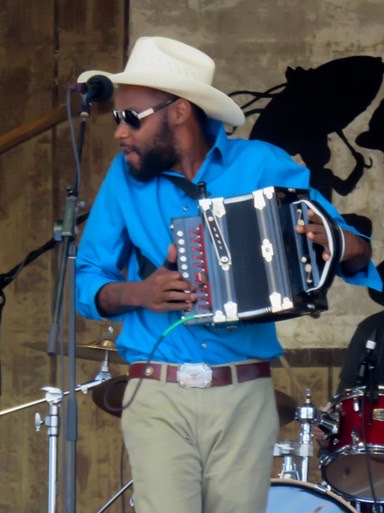 Meanwhile, over at the Fais Do Do stage, something odd was happening. When I arrived to see one of my favorite Louisiana bands, Cedric Watson and Bijou Creole, the band was on stage and playing but Cedric Watson was nowhere to be found. A couple of minutes after I arrived, he ran out onto the stage, plugged in, and away we went. He said something about Jazz Fest should know not to book the younger acts early in the day, so it sounds like maybe he had a late night and got up late.