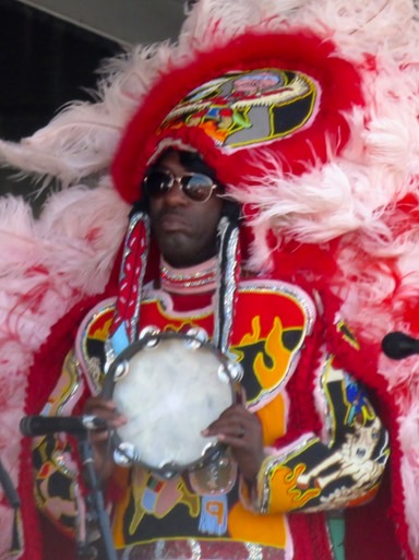 The Indians arrayed across the front of the stage play bass drum and timbales in addition to tambourine and other percussion, and Big Chief Bossier draws as effectively from hip-hop as he does from decades of Indian vocalizing. It was very exciting to hear. While I love all of the Mardi Gras Indians, this group had a modern sound that was refreshing. Here’s my video and here's 15 minutes or so from the Louisiana Music Factory in 2015. For some more background, here is a print interview with Big Chief Bossier.
