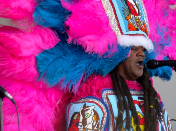 While she was doing that, I paid yet another visit to the Jazz and Heritage stage to catch another Mardi Gras Indian group, the 79'rs Gang. This group is made up of two tribes. Big Chief Jermaine Bossier brings the 7th Ward Creole Hunters and Big Chief Romeo Bougere brings the 9th Ward Hunters. That's how you get 79'rs.