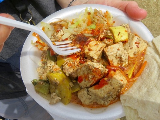 Laurie's brunch was spicy grilled tofu and veggies with peanut sauce from Gambian Foods. Our experience with these folks began on Day 3 all the way back in 2012, when we had their pitas (steak for me, veggie for Laurie). Laurie had the veggie again on Day 10 in 2013. There, you can read about Tejan Jallow and Charlie Mendy of Gambian Foods. Laurie had her first bowl of their tofu grilled with hot pepper flakes and yellow squash served over couscous and warm cabbage and topped with orange peanut sauce on Day 3 in 2014 and continued to enjoy it on Day 8 and Day 11 in 2015, Day 9 in 2016, and Day 3 last year. That could be some kind of record!