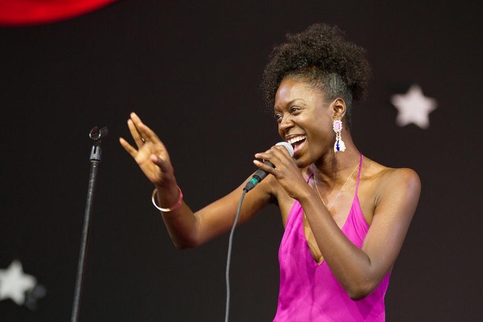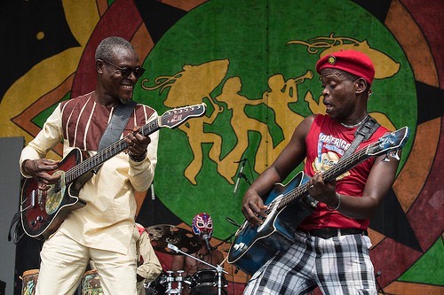 ... she stayed around Congo Square to hear some of Jupiter and Okwess, a very hot African band. Jupiter Bokondji, now 53, was born in Kinshasa in the Democratic Republic of Congo, three years after the country gained its independence. His father was a Congolese diplomat. It was his grandmother, a traditional healer, who got him started in music as he attended ceremonies and funerals with her to play percussion instruments like drums.