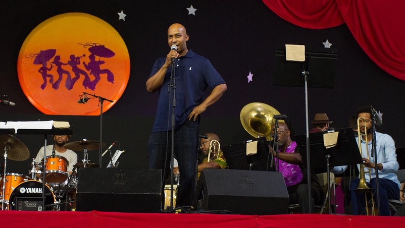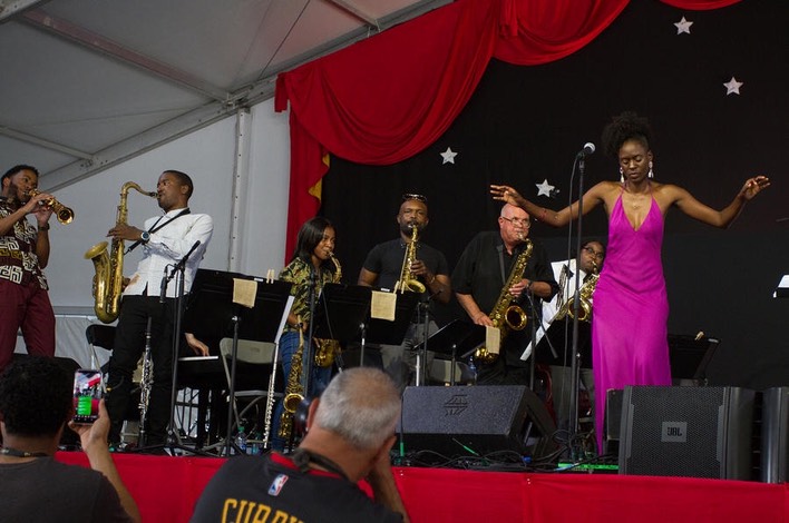 At the Jazz Tent, the New Orleans Jazz Orchestra under the direction of Adonis Rose was playing. This is a group of some of the most talented players in the city, and you can read a lot more about the orchestra and its involvement in the community in the entry from Day 9 in 2016, when I saw them on the Congo Square stage.