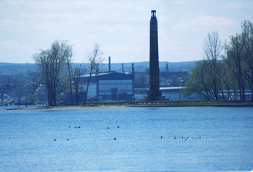 The monument commemorates Perry's fleet, which won the Battle of Lake Erie. Perry built the fleet here in 1812. Behind it is Erie Ship Works, the largest dry dock for shipbuilding on the Great Lakes