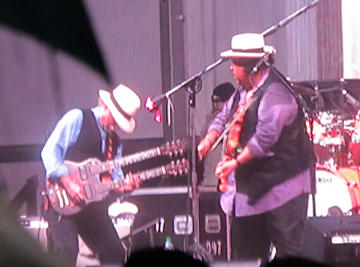 The fabulous guitarist Roy Rogers playing with the Paraguayan fiddler Carlos Reyes,taken from the screen from outside the Blues Tent because it was packed