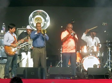 On our way around the track, we stopped by the Jazz Tent to hear a few minutesof Blodie's Jazz Jam, let by trumpeter Gregory Davis of the Dirty Dozen Brass Band.He's next to drummer Julian Addison.
