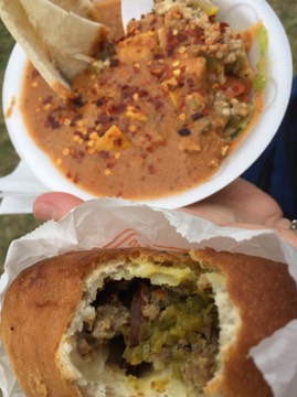 Above my stuffed bread is the Gambian grilled tofu with veggies, couscousand spicy peanut sauce that Laurie had for her brunch
