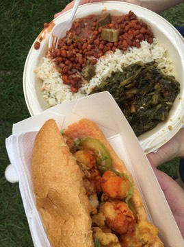 Mid-day food was a fried alligator po' boy for me andcrowder peas with okra and collard greens for Laurie
