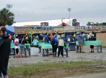 Once we got to the Fair Grounds, as usual a little before 11, we noticed a long line beginning at the security checkpoint, and it wasn't moving. Vehicles were rushing around the racetrack and large trucks were entering near the bus dropoff. What was happening was an all-out effort to dry out Jazz Fest. Apparently it had rained even more overnight, and the grounds could hold no more water. The organizers were doing everything they could, bringing in sand, placing large sheets of plywood on top of mud, even using reverse pumping trucks to vaccuum up standing water. The friendly security people and ticket takers informed us that the festival would be opening an hour later than normal and the schedule would be adjusted, whatever that meant. So now I'm standing in a line, in my shorts and short-sleeve shirt with no outerwear other than a piece of plastic, in 50-something degrees with a strong wind, and not even being able to generate heat by moving. This day was not going to be easy.