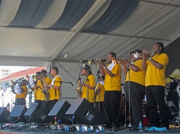 Time to crank it up with the Pinstripe Brass Band on the Jazz and Heritage Stage