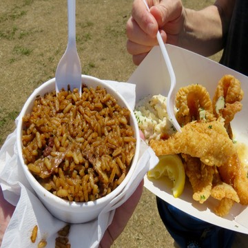 Breakfast: Jambalaya for me, catfish and potato salad for Laurie