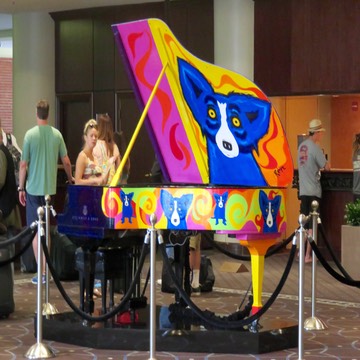 A Rodrigue Blue Dog piano in the Sheraton's lobby