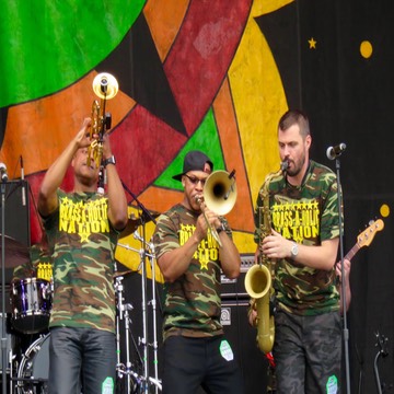 At the Congo Square Stage, go-go funk from the Brass-a-Holics