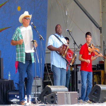 Mark Stoltz on scrub board, Joe Hall on accordion, and Zack Fusilier on fiddle