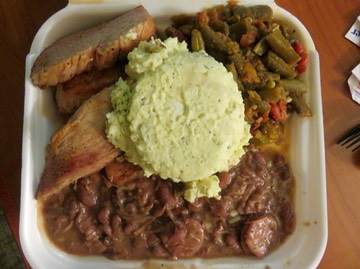 Dinner from Mother's: Baked ham, green beans, potato salad, red beans and rice with andouille