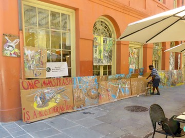 There's the artist, working on Exchange Place, an alley between Conti and Bienville Streets.His friendly little dog, wearing a jester getup, roams around the store and the alley.