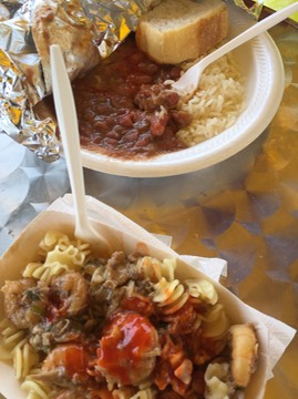 Brunch: Red beans and rice for Laurie, Cajun shrimp and duck pasta for me