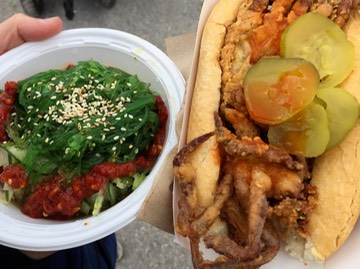 Food! Seaweed and cucumber salad with hot chili sauce, the awesome soft-shell crab po' boy