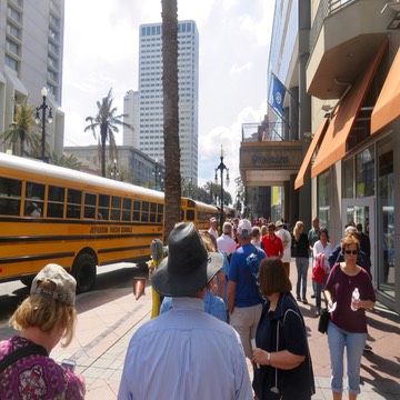 Shuttle bus queue at the Sheraton on Canal Street. We're going to Jazz Fest!
