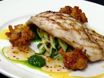 For Laurie, grouper with Thai mirliton slaw, spicy crawfish fritters with hot pepper jelly and chili oil
