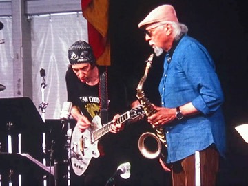 The Jazz Tent was packed for the set by the legendary Charles Lloyd, so more photos from the video board