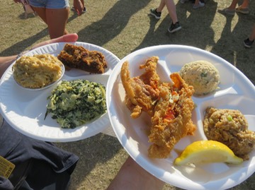 A couple of platters for an early dinner: on the left, her seafood au gratin, spinach-artichoke casserole, and sweet potato pone; and on the right, my fried catfish, crabmeat stuffing, and potato salad