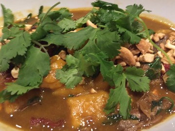 I had goat curry: brined, braised, and shredded goat with sweet potato gnocchi, cashew pieces,cilantro, and a deep brown coconut curry