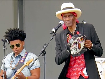 Cyril taps the beat on the tambourine used by his uncle, George Landry,Big Chief Jolly of the Wild Tchoupitoulas Mardi Gras Indians