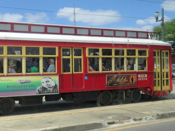 Crowded streetcar heading toward City Park and the Fair Grounds